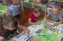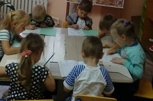 Дети средней группы с воспитателем выкладывали шариками из пластилина цифры, нарисованные на бумаге, закрепляя цвет, цифры, развивая моторику рук.