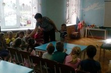 Дети с воспитателем в младшей группе лепили зернышки для петушка по сказке "Кот,петух и лиса".