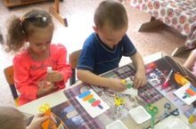 Дети средней группы проводили аппликацию на тему: " В магазин привезли красивые пирамидки".