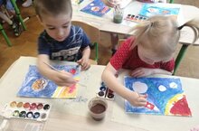 В день космонавтики дети старшей группы смотрели презентацию о космосе и космонавтах.Узнали много нового и интересного. А также на занятии по рисованию знакомились с новым способом рисования-набрызгиванием. Дети рисовали звёздное небо при помощи кисти и зубной щетки.