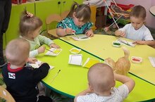 На тематической недели "Зимние забавы" дети 2 группы раннего возраста рисовали шарфик для кошечки и продолжали учиться рисовать вертикальные линии, не заходя за контур.