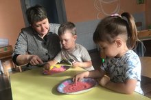 Дети младший группы нарисовали манной крупой солнышко.