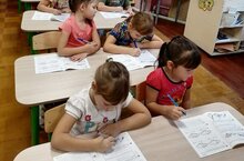 На занятии по развитию математических способностей дети подготовительной группы закрепляли знания в рабочих тетрадях.