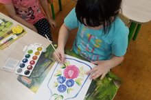 Дети старшей расписывали доску городецкой росписью. Тем самым развивая чувства цвета, ритма, композиции. Работы получились яркие и красочные.