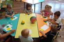 Дети младший группы выполнили аппликацию на тему: «Большие и маленькие мячи», закрепили представления о предметах круглой формы, их различие по величине.