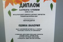 Подведены итоги международного конкурса детского творчества "Осенняя мастерская - 2020". Наша воспитанница Ошина В. заняла 1 место в номинации декаротивно-прикладное творчество.