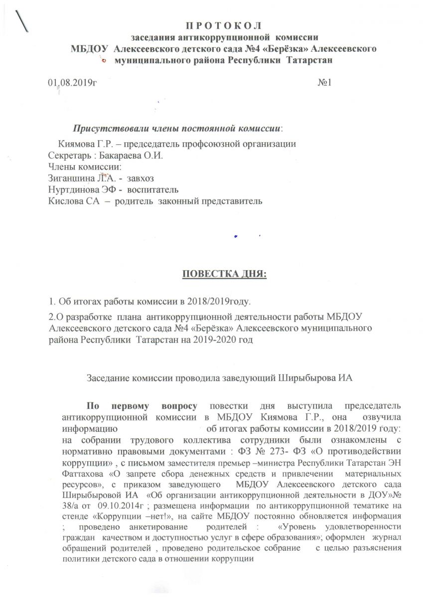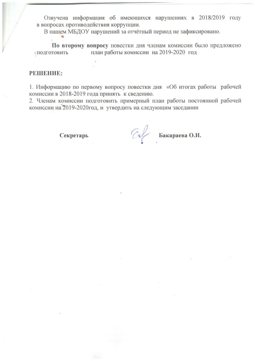 Протокол заседания антикорупционной комиссии за 2018 - 2019 уч.год