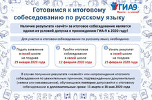 Итоговое собеседование в 2019/2020 учебном году по русскому языку 20.01.2020 Итоговое собеседование в 2019/2020 учебном году проводится 12 февраля 2020 года (во вторую среду февраля).В случае получения неудовлетворительного результата («незачет») за итоговое собеседование обучающиеся, экстерны вправе пересдать итоговое собеседование в текущем учебном году, но не более двух раз и только в дополнительные сроки, предусмотренные расписанием проведения итогового собеседования – 11 марта 2020 года (во вторую рабочую среду марта) и 18 мая 2020 года (первый рабочий понедельник мая).Итоговое собеседование как условие допуска к государственной итоговой аттестации по образовательным программам основного общего образования (далее – ГИА) проводится для обучающихся IX классов.Заявления подаются участниками ГИА лично на основании документов, удостоверяющих личность, или их родителями (законными представителями) на основании документов, удостоверяющих, или уполномоченными лицами на основании документов, удостоверяющих личность, и доверенности (оформленной в установленном порядке).Подробнее...