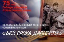 Стартовал Всероссийский конкурс сочинений среди школьников «Без срока давности», приуроченный к 75-летию Победы 13.12.2019 С 9 декабря 2019 года по 28 февраля 2020 года Минпросвещения России совместно с органами исполнительной власти субъектов Российской Федерации в сфере образования проводит Всероссийский конкурс сочинений среди школьников «Без срока давности», приуроченный к Году памяти и славы в 2020 году.К участию в конкурсе приглашаются учащиеся 5–11-х классов общеобразовательных организаций.В конкурсных сочинениях участникам предлагается рассмотреть один из вопросов, связанных с сохранением и увековечением памяти о Великой Отечественной войне 1941–1945 годов (ВОВ):
