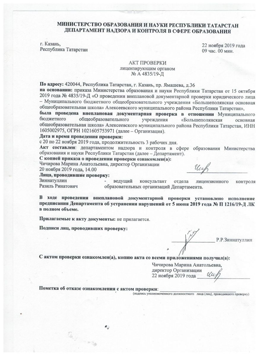 ►Акт проверки органом государственного контроля(надзора) в сфере образования № А 1216/19-Д;