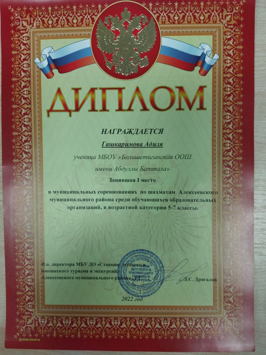 Гашкаримова Адиля ученица 7 класса участвовала в муниципальных соревнованиях по шахматам Алексеевского муниципального района среди обучающихся ОО, в возрастной категории 5-7 классы и заняла почетное ! место. Награждена Адиля грамотой за участие в зональном семинаре по экологическому воспитанию по теме: "Сохранение чистоты родного села", руководитель Галимов И.Н. Поздравляем !