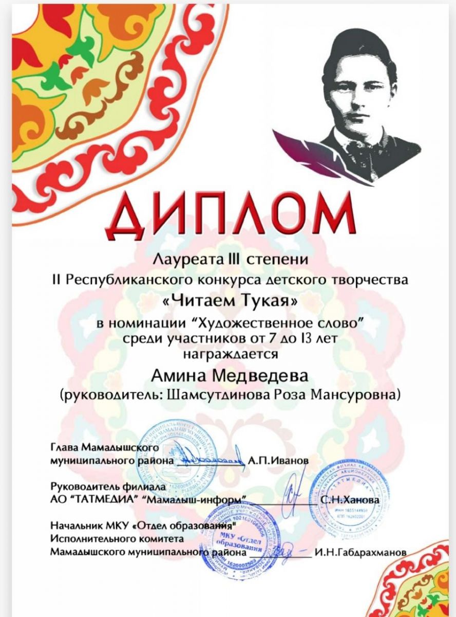 Медведева Амина участвовав в Республиканском конкурсе детского творчества "Читаем Тукая" в номинации "Художественное слово" среди участников от 7-13 лет была награждена Дипломом Лауреата III степени. Руководитель Шамсутдинова Р.М. Поздравляем!!!