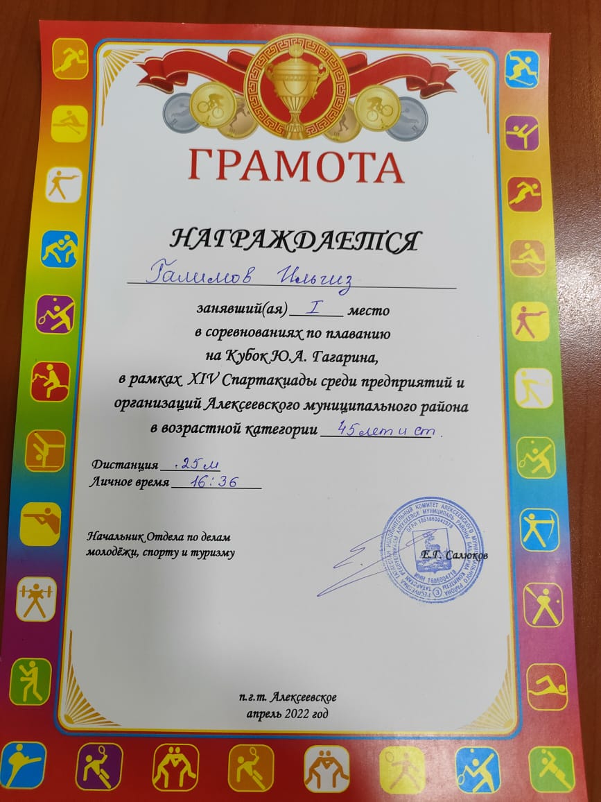 Педагоги нашей школы активно участвовали в соревнованиях по плаванию на Кубок Ю.А.Гагарина. Соревнования прошли в рамках XIV Спартакиады среди предприятий и организаций Алексеевского муниципального района. Учитель физкультуры Галимов И.Н. занял почётное I место в возрастной категории 45 лет и старше. Поздравляем!
