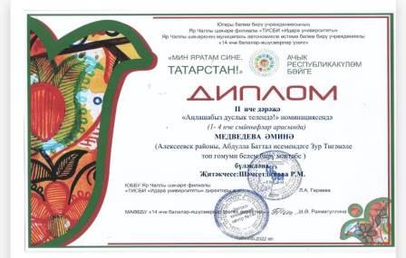 Ученица 1 го класса Медведева А. участвовала в Республиканском конкурсе "Я люблю тебя, Татарстан!" в номинации:"Общаемся на языке дружбы" и была награждена Дипломом II степени. Руководитель Шамсутдинова Р.М.Поздравляем!.