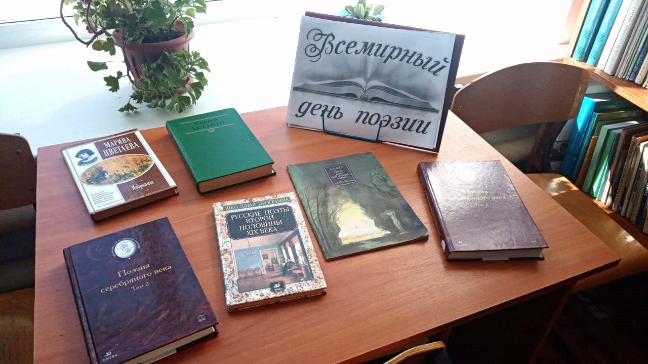 К этой дате в школьной библиотеке оформлена книжная выставка «Всемирный день поэзии», которая позволит вновь прикоснуться к чарующим силам поэтического дара поэтов всех времен: С. Есенина, А. Ахматова, Ф. Тютчева, А. Фета, Н. Гумилева,Н.Рубцов и других.