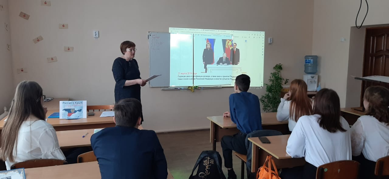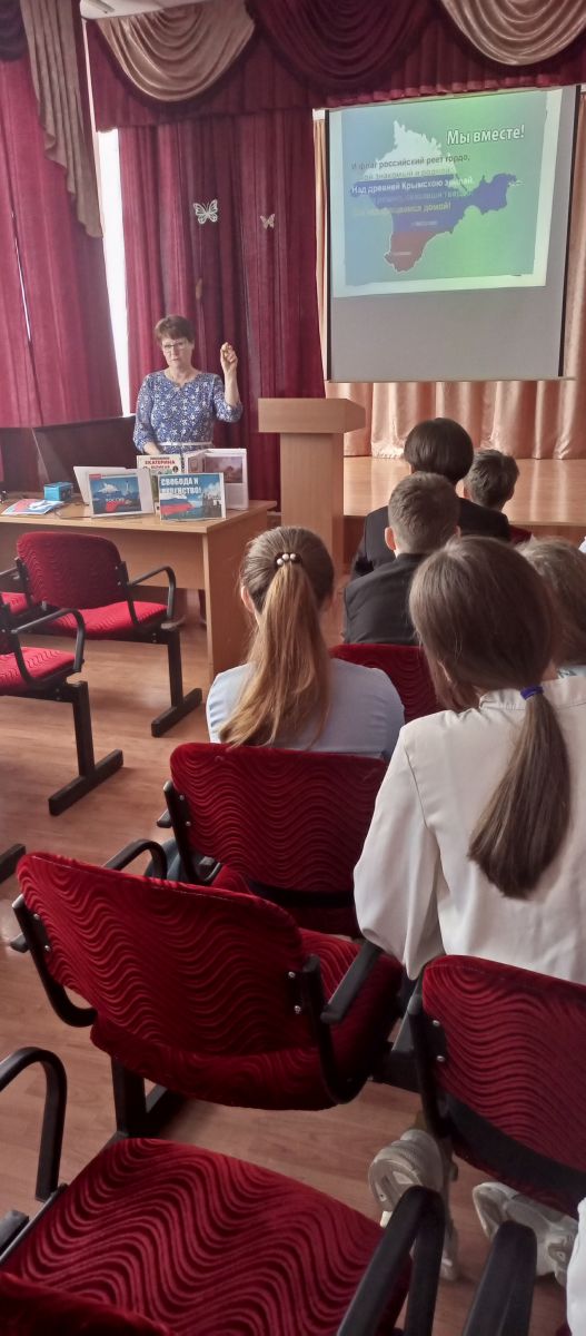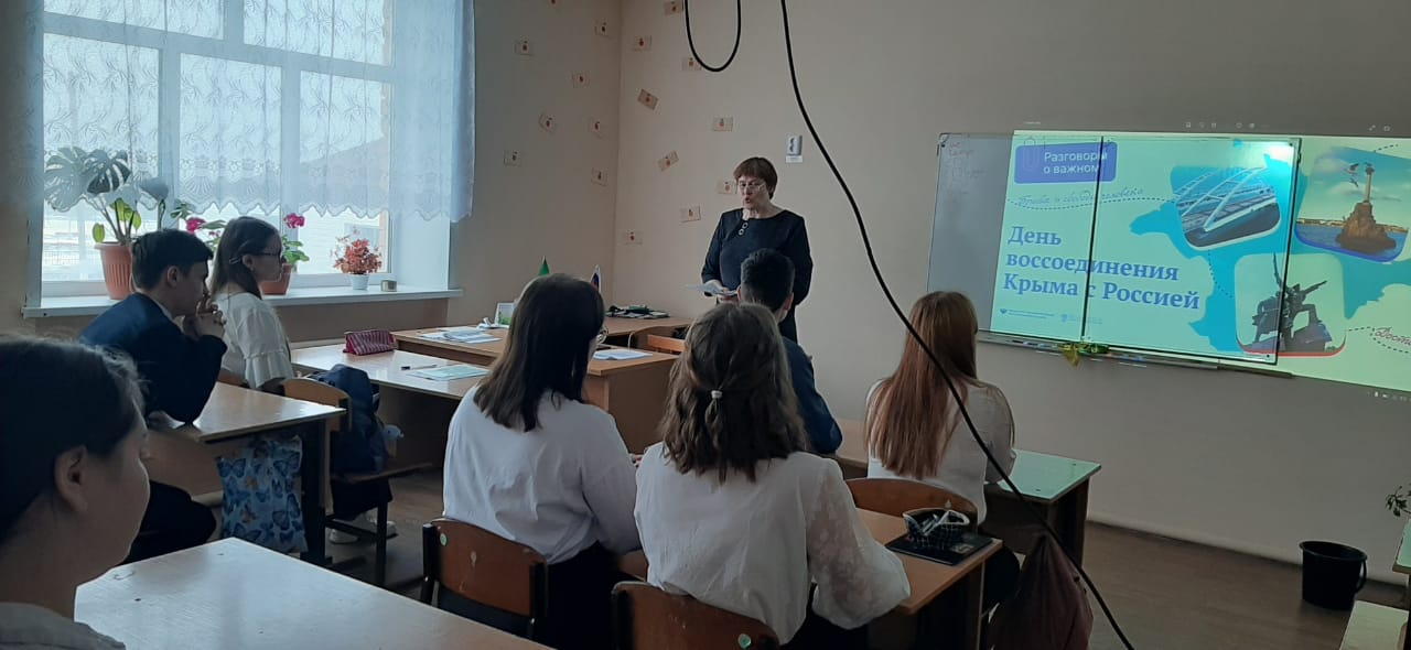 20.03 Разговор о важном был посвящён дню воссоединения Крыма с Россией, для проведения мероприятия классного часа были приглашены библиотекари детской сельской библиотеки.Библиотекари провели познавательную беседу с обучающимися 11 -го и 7-ых классов. В остальных классах проводили урок Разговор о важном, классные руководители.