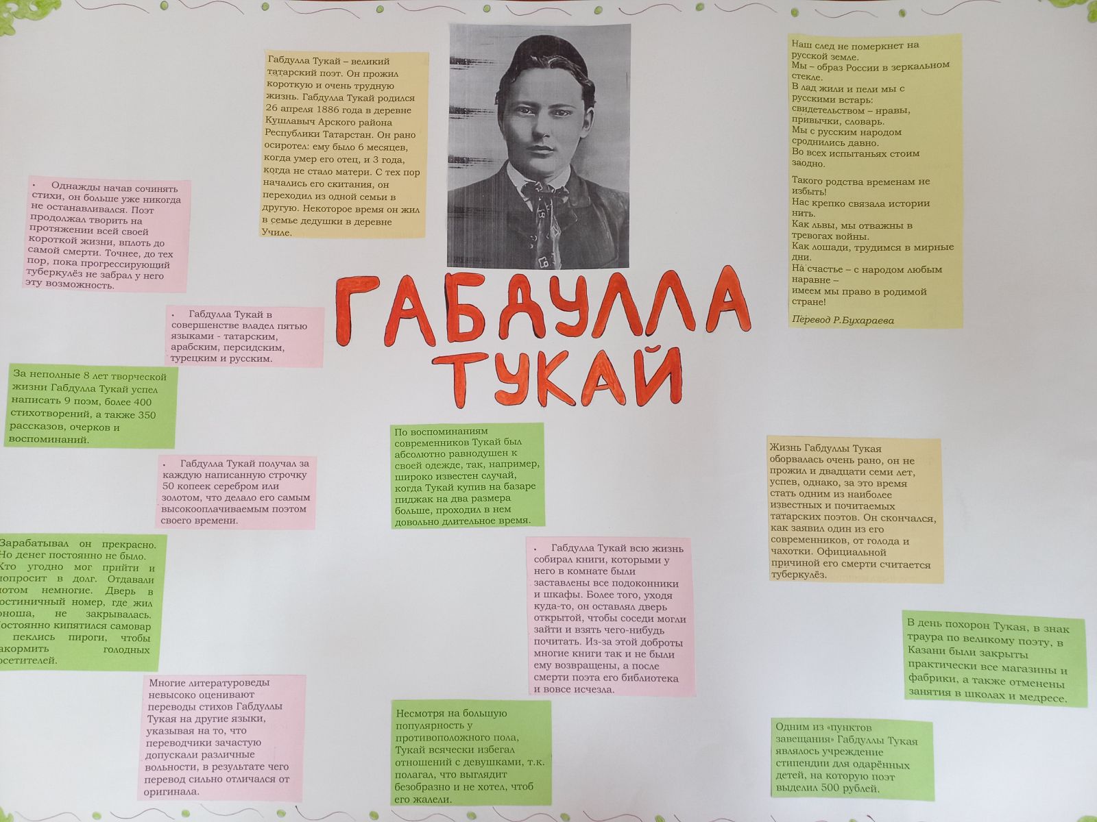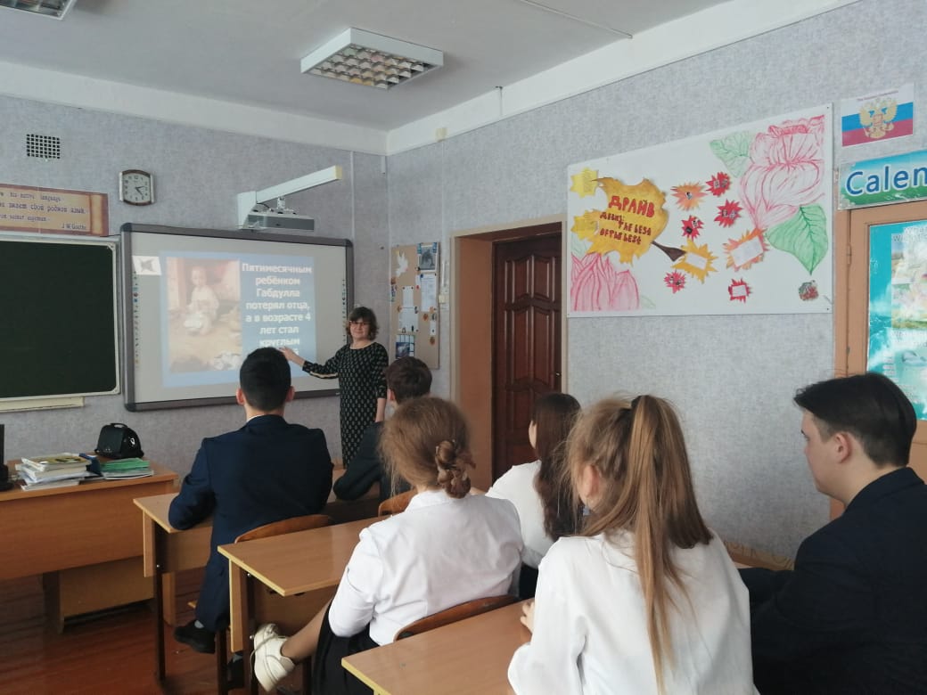 В рамках Дня родного языка с учащимися 10-11 классов провели литературный час, посвященный великому поэту Г. Тукаю. Ребята вспомнили о тяжёлом детстве поэта, о его жизни и творчестве. Читали стихотворения поэта.