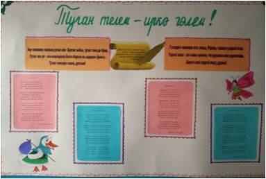 Туган тел атнасының беренче көнендә өлкән сыйныф укучылары стена газеталары чыгардылар. Башлангыч сыйныф укучылары өчен» Күңелле тәнәфес" - татар мультфильмнарын карау уздырылды. -