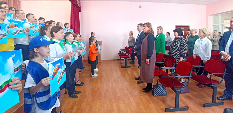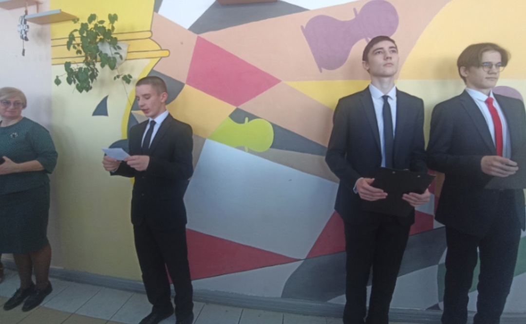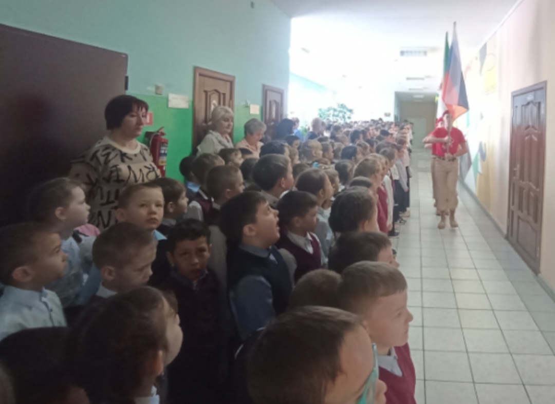 Еженедельная линейка состоялась с поднятия флагов и пения гимнов РФ и РТ. 8 Б класс поделились новостями.