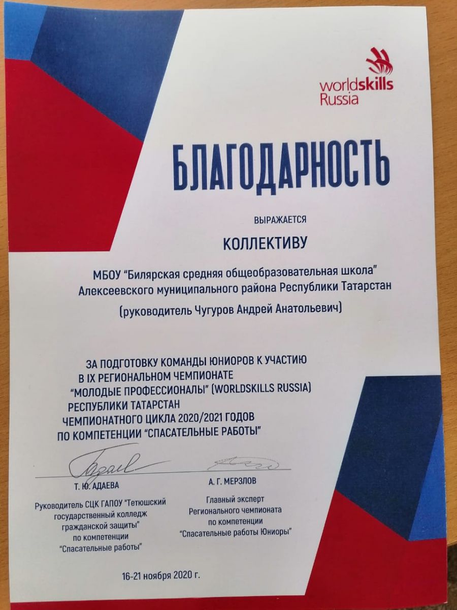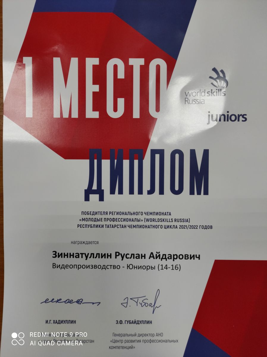 Выпускник 9 класса 2021 года Билярской СОШ Зиннатуллин Руслан, студент Государственного автономного профессионального образовательного учреждения «Международный центр компетенций - Казанский техникум информационных технологий и связи» стал победителем Регионального чемпионата «Молодые профессионалы» (WORDSKILLS RUSSIA) Республики Татарстан Чемпионатного цикла 2021-2022 годов. Направление «Видеопроизводство-Юниоры», 14-16 лет. Поздравляем Руслана и желаем дальнейших побед!!!