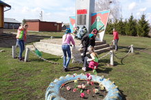 Трудовой десант по поддержанию чистоты и порядка у памятника Славы. Учащиеся постоянно содержат в чистоте территорию памятника.