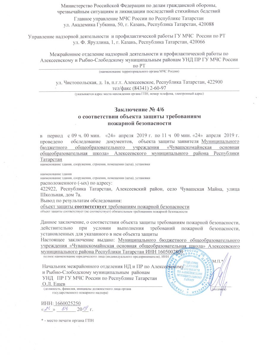 Заключение о соответствии объекта защиты требованиям пожарной безопасности/ Саклау объектының янгын куркынычсызлыгы таләпләренә туры килүе турында бәяләмә