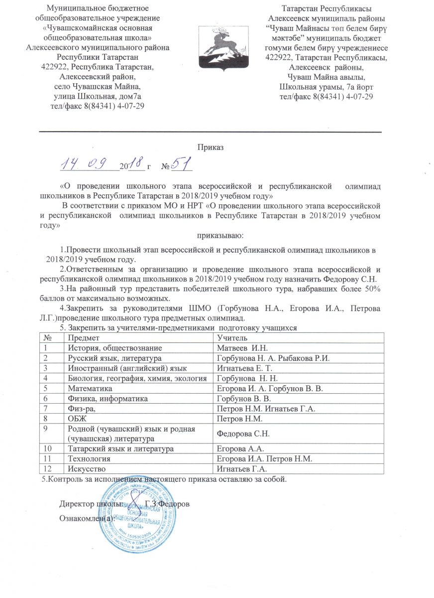 3. Приказ МБОУ "Чувашскомайнская ООШ" "О проведении школьного этапа всероссийской и республиканской олимпиады школьников в 2018-19 уч.году" №51 от 14.09.2018