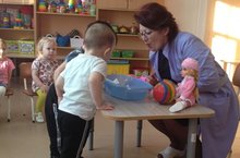 Ольга Анатольевна в ходе игры с дидактическим материалом формировала у детей цветовое восприятие, учила повторять отдельные слова: листья, летят, жёлтый, красный.