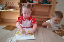 Дети второй группы раннего возраста попрощались с осенью, нарисовали осенний дождь кисточками и красками, поиграли в свою любимую осеннюю игру "Солнышко и дождик". Поработали золушками. Перебирали фасоль и засыпали её в баночки. Делали это с удовольствием. Так что ,уважаемые родители , у вас растут помощники.