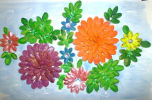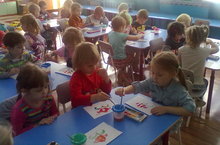 Старшие вырезали узоры из бумаги сложенной вдвое, дети среднего возраста обводили трафареты и затем вырезали и наклеивали. Малыши наклеивали готовые формы.