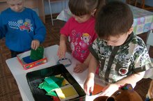 Младшие дети разбирают фигуры по цвету, старшие - по геометрическим формам.