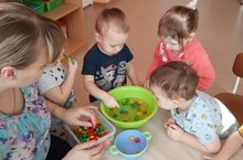 Воспитатель провела с детьми игру с водой "Разноцветные колечки", в ходе которой у детей развивалась координация и ловкость рук. Игра доставила детям радость.