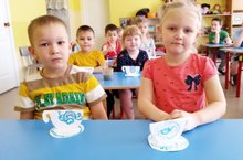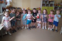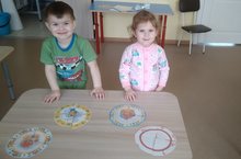 Воспитатель учила детей раскатывать пластилин круговыми движениями ладоней. Закрепляла приёмы лепки: отделять части из целого куска пластилина и соблюдать их размер при лепке. Развивала у детей мелкую моторику рук.