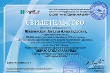 Педагоги ДОУ, Шерстнева О.Л, Шалкинская Н.А., приняли участие во Всероссийской научно-практической конференции "Образовательная среда" и стали авторами научно-практических работ "Кукольные уроки" (Шалкинская Н.А.) и "Использование многофункциональных пособий в сенсорном развитии детей" (Шерстнева О.Л.)