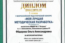 По итогам V Всероссийского педагогического конкурса "Моя лучшая методическая разработка", воспитатель Федорова О.А. заняла 1 место. На конкурс был представлен авторский материал «Много есть профессий разных, много всяких нужных дел…» Поздравляем.