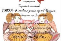 Педагоги детского сада приняли активное участие во Всероссийском конкурсе Кукольные уроки», организованного журналом «Обруч». На конкурс принимались всевозможные игровые сценарии и варианты оформления пространства для игр с куклами. Интересные примеры, истории из детства, педагогические наблюдения и разработки.В его организации журналу помогал магазин «Кукла Миа», который приготовил для победителей номинации «Наряды для кукол» специальный приз – куклу. Коллектив нашего детского сада, «За искреннюю любовь к куклам» награжден специальным призом – куклой Артемкой и Почетной грамотой. -