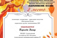 Воспитанники старшей группы приняли участие в Республиканском конкурсе творческих работ среди воспитанников и учащихся "Вдохновение осени". Королев З. стал победителем конкурса 2 место, в номинации декоративно-прикладное искусство. Дубицкая У. заняла 3 место с работой "Королева осени". Поздравляем ребят с победой.