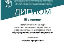 25 октября 2022, были подведены итоги Республиканского конкурса авторских методических разработок профориентационных мероприятий "Профориентационный марафон". Педагоги Ситдикова Р.Р. заняла 3 место, в номинации "Азбука профессий", Фомина Н.А. заняла 3 место, в номинации "Азбука профессий". Поздравляем молодых педагогов с победой!