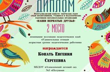 Подведены итоги Республиканского конкурса "Наши пернатые друзья". Воспитатель Копать Е.С. заняла 2 место, в номинации - коллекция педагогических идей "Удивительные птицы". Поздравляем.