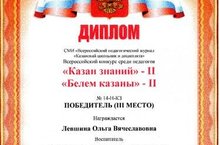 Подведены итоги республиканского этапа Всероссийского конкурса среди педагогов "Казан знаний- II". Воспитатель Левшина О.В. заняла 3 место. Поздравляем.