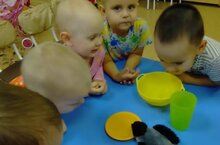 К детям второй группы раннего возраста прилетела птичка. Детки дали птичке воду, напоили ее водой.
