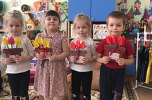 Тюльпаны - красивые, яркие весенние цветы. Именно по - этому педагоги младшей группы, Левшина О.В. и Чунина Т.Ю., я выбрали в качестве подарка для мам, изготовление поделок с этими цветами. Букетик в симпатичном горшочке украсит и дом и рабочий стол мамы.