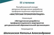 Старший воспитатель ДОУ, Шалкинсккая Н.А. и воспитатель татарского языка, Миндубаева Алсу Минхатовна, приняла участие в Республиканском конкурсе методических разработок профориентационного мероприятия по теме "Экскурсовод мини-музея "Маленькое окно в большой мир" и заняли 3 мсто среди 164 участников данного конкурса (112 участников конкурса получили сертификаты участников).