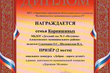 Наш детский сад принял участие в зональном конкурсе семейных проектов по ПДД «Добрая дорога детям», который проходил на базе МБДОУ №20 г. Чистополя. Детский сад представляла семья Корнишиных (старшая группа), которая заняла в конкурсе второе место.
