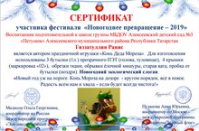 Ребята, родители и педагоги нашего детского сада получили сертификаты за участие во Всероссийском фестивале "Новогоднее превращение - 2019". На этот фестиваль были предоставлены работы, выполненные из различного пластикового мусора (пластиковых бутылок от напитков, флаконов от шампуней и т.д.). Подробно описан процесс изготовления данной работы и придуман новогодний экологический слоган, например вот такой - «Береги природу – утилизируй отходы и в новом году жди от Мышки доходы!».