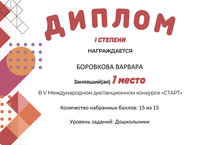 23 воспитанника подготовительной к школе группы участвовали в международном конкурсе «Старт». Конкурс проходил среди детей дошкольного возраста по теме «Окружающий мир». Все ребята справились с предложенными заданиями и получили дипломы 1, 2 и 3 степени. Спасибо педагогам и родителям, которые помогли подготовить победителей данного конкурса.