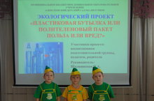 В соответствии с планом МКУ «Отдел образования Алексеевского муниципального района РТ», на 2018-2019 учебный год в целях накопления и распространения опыта по экологии среди воспитанников образовательных организаций Алексеевского муниципального района Республики Татарстан, 29 марта, на базе МБДОУ №5 "Солнышко", прошел конкурс «Экологический калейдоскоп», в котором участвовали 7 дошкольных организаций.Воспитанники подготовительной группы защищали свои проекты. Наша команда «Экопатруль» (Ситдиков Раиль, Косова Есения, Владимиров Антон) защищала проект «Пластиковая бутылка и полиэтиленовый пакет – польза или вред!» и заняла третье место.Молодцы ребята! -