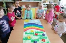 Под руководством педагога Шаровой Т.А. воспитанники средней группы №1 выполнили коллективную работу "Путешествие по радуге". Цель данной работы - продолжать знакомить детей с такими явлениями природы как радуга, цветами спектра. Педагог вызвала интерес к изображению радуги и обучила детей передавать цвета радуги в определённой последовательности.
