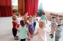 Малыши второй группы раннего возраста ещё только учатся играть вместе, в этом им помогает педагог. Дети учатся делать ровный круг, держаться за руки, выполнять несложные ритмические движения, повторяя за педагогом. Знакомятся с музыкальным залом, его атрибутикой. Воспитанникам очень понравились игры малой подвижности "Карусели", "Пузырь", "Зайка беленький сидит"...