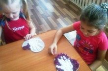 Чтобы у малышей средней группы получился красивый подарок - им пришлось потрудиться! Они скатывали кусочки салфетки в шарики, потом наклеивали на контур определенные цвета шариков.
